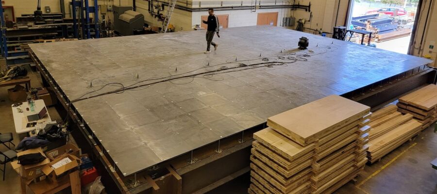 Testing on a FastFloor C prototype was recently conducted at Virginia Tech. A 10-ft-wide by 22-ft-span FastFloor module was subjected