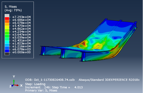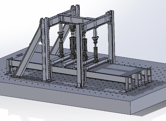 Research at Northeastern University (Ruipeng Liu, Sujit Bhandari, Jerome F. Hajjar) is focusing on the structural behavior of the FastFloor system subjected to gravity loading, including studying plate buckling, local buckling between fasteners, and composite action between the beam and the diaphragm. Finite element simulation is employed to investigate and predict potential failure modes, which are then validated through full-scale experimental testing of a FastFloor module attached to an edge beam with high-strength steel bolts and Shuriken nut assemblies. The experimental testing is conducted at the Laboratory for Structural Testing of REsilient and Sustainable Systems (STReSS Laboratory). Figures 1 and 2 represent two different specimens with four actuators applying gravity load to the specimens.