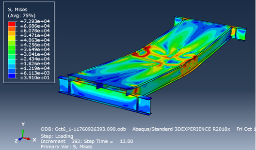Nonlinear finite element analyses have been completed for two different test specimens, each 10 feet wide by 40 feet long. One specimen is simply supported, while the second specimen frames into a W30X108 girders using a shear tab at one end and seated connection located at the mid-height of the web at the other end. Figure 3 represents the simply supported FastFloor system after application of gravity load. Figure 4 represents the FastFloor system supported by W30X108 girders before and after application of gravity load. The FastFloor system, whose design is controlled by vibrations, exhibits significant overstrength. The plate reliably provides sufficient restraint through composite action to recover the flexural strength of the three bare steel beams, and approaches the full composite strength, although inelastic local buckling failure modes control the ultimate strength. These results will be supported by experimental testing.