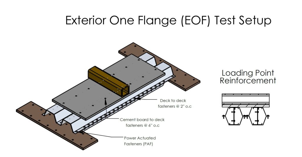 Ongoing work on FastFloor R is moving into Phase 3 which focuses largely on the potential web crippling limit states in the module. Phases 1 and 2 primarily addressed bending strength, deflection, and vibration performance, while Phase 3 expands the scope to evaluate web crippling behavior. (In the earlier phases, measures were taken to avoid web crippling in the deck profile.) The initial Phase 3 investigations concentrate on Exterior One-Flange (EOF) and Interior One-Flange (IOF) loading conditions, with bearing lengths and end details consistent with those used in Phase 2 testing. The expectation is that the attachment of the cementitious panel further stabilizes the section and distributes the load in a beneficial manner not accounted for in current provisions. Testing initiates this Spring with material currently being sent to the lab at Johns Hopkins where the work will be conducted.