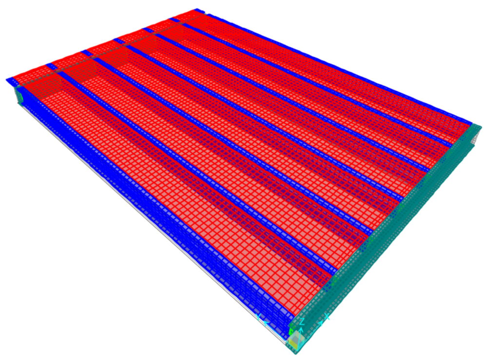 At West Virginia University (Sahab Rifai, Onur Avci) following the recent completion of vibration testing, finite element modeling and calibration of the full-bay FastFloor C specimen are underway. The testing program included experimental modal analysis as well as human walking tests conducted at subharmonic frequencies of the floor’s natural modes. The updated finite element models in SAP will be used to predict floor acceleration responses and compared against experimental results. This comparison supports the evaluation of existing design methods for estimating peak accelerations induced by human walking and is aimed at providing engineers with design methods that can be used in practice.