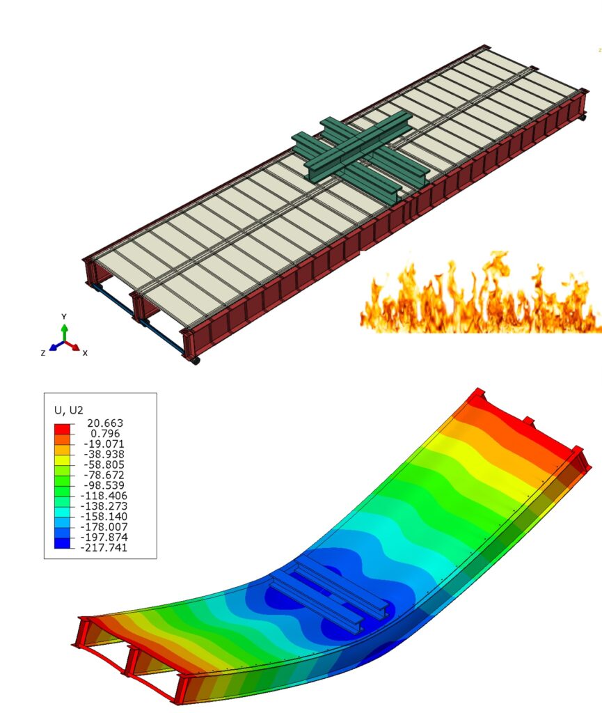 The research team at Purdue university (Shivam Sharma, Amit Varma) is currently investigating the fire performance of the FastFloor system. Nonlinear inelastic finite element models (2D and detailed 3D) have been developed and validated using results from experimental and numerical testing at ambient temperatures. Different types of commercially available fire protection materials including spray applied fire protection materials (SFRMs) and intumescent coatings are being evaluated. The models are used to assess the thermal response and then the structural response of the FastFloor modules subjected to gravity loading corresponding to the applicable fire load combination.